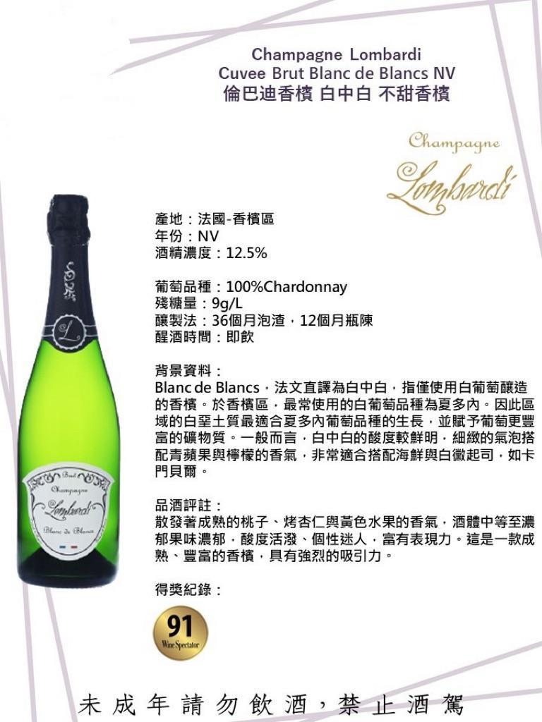 商品詳情 產地/國家 法國酒 精 濃 度 12.5 %容 量 750ML規 格 瓶 倫巴迪香檳 白中白不甜香檳 Champagne Lombardi Cuvee Brut Blanc de Blancs NV