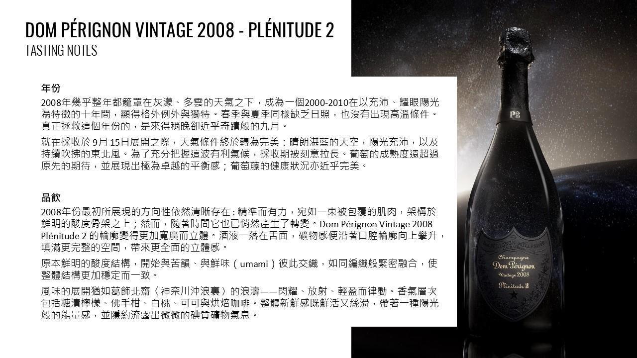 商品詳情 產地/國家 法國品牌/酒莊 Dom Pérignon 香檳王酒 精 濃 度 12.5 %容 量 750ML規 格 瓶 香檳王 P2 2008年份香檳(裸) DOM PERIGNON VINTAGE 2008 PLENITUDE 2