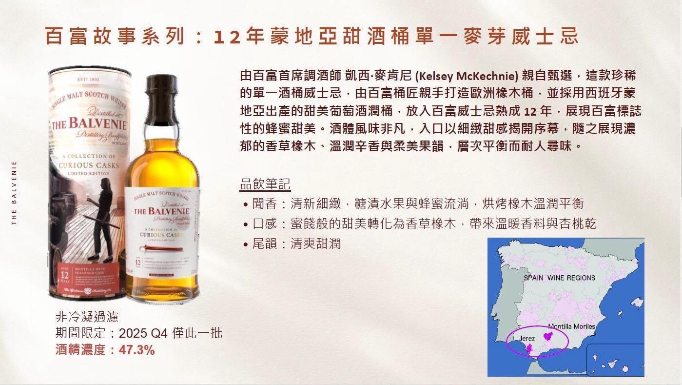 商品詳情 產地/國家 蘇格蘭品牌/酒莊 百富酒 精 濃 度 47.3 %容 量 700ML規 格 瓶 百富故事系列 12年蒙地亞甜酒桶 The Balvenie A Collection of Curious Casks Limited Edtion - 12Y Montilla Wine Seasoned Cask